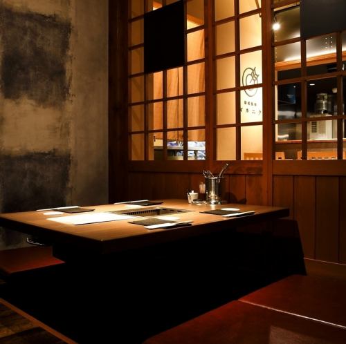 【お座敷席ございます】小上がりの座敷に上がれば打ちっぱなしの壁や和の趣が融合するスタイリッシュな掘りごたつ席。デートや接待などにもおすすめできる上品な雰囲気の中、心よい時間をお過ごしください。